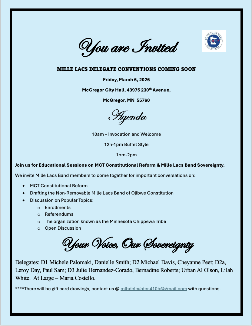 On February 18, 2026, the Mille Lacs Band Delegates presented to the Joint Assembly to provide an update on current efforts and outline the next phase of community engagement and constitutional work.