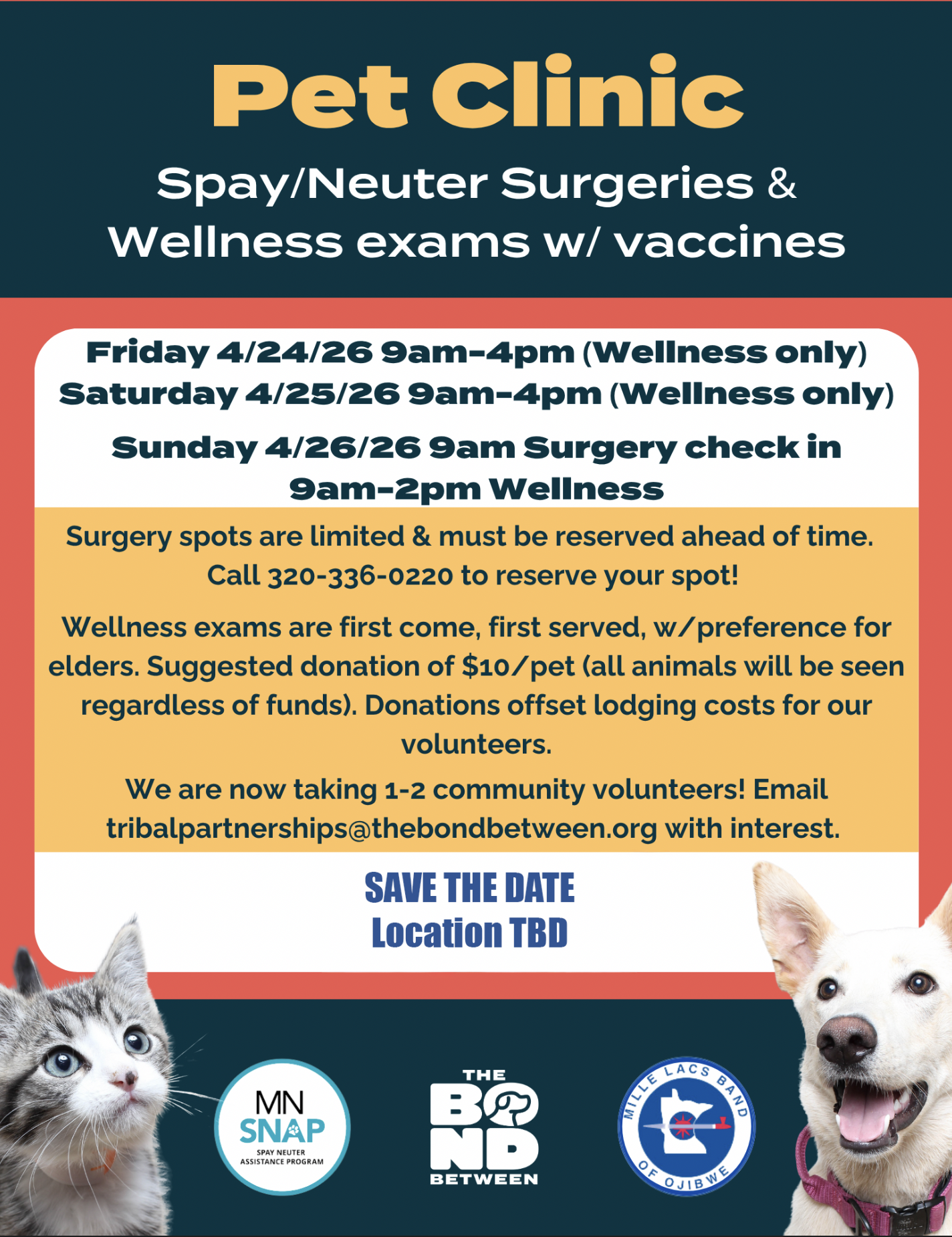 As we move into the new year, we want to reassure Band members that we are working hard to keep pet healthcare available in our communities. The Bond Between is scheduled to visit District Ill (location TBD) in April and Chiminising in May. Community members from all districts are welcome to attend those clinics for services. The Bond Between will be extending clinic days/hours and bringing additional volunteers to accommodate the community through these clinic dates and locations.