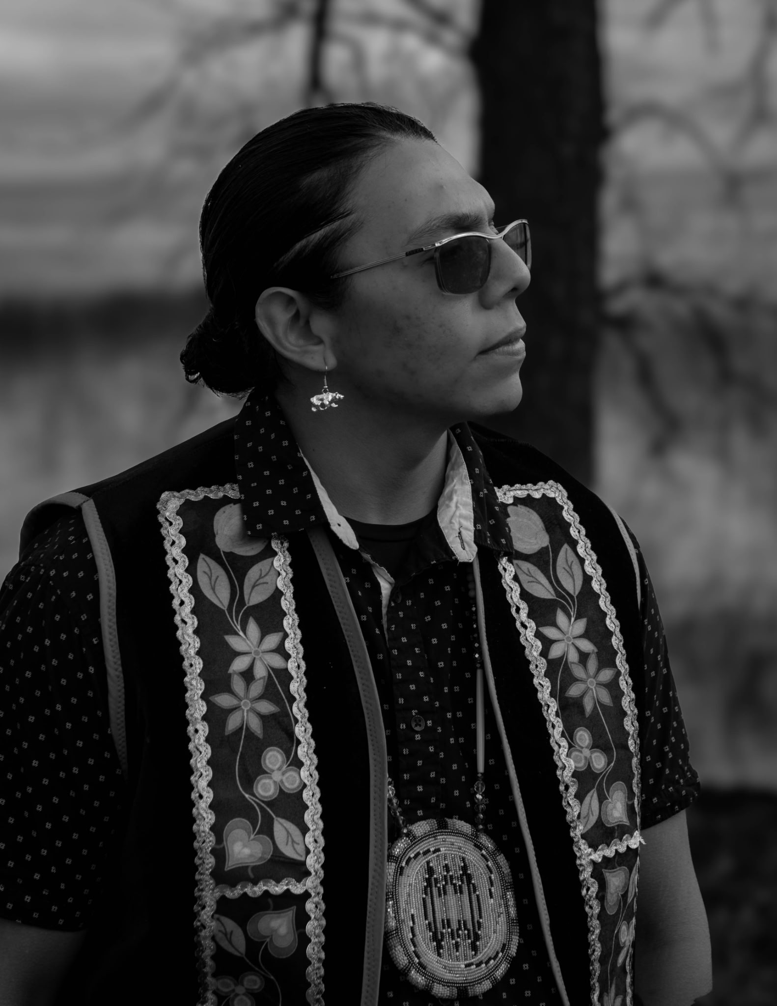 "I remember being little and thinking someday when I grow up l'm going to work for my Tribe — work for my people. I didn't know what I would be doing, but I took a lot of pride in that." Today he carries those teachings forward. Oswaldson is a seated ceremonial dancer who dances for the food. He is also a drum keeper and pipe carrier.